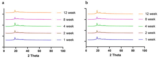 PXRD diffractograms of spray-dried CFZ SD microparticles during storage for 12 weeks at (a) 4 °C and (b) 25 °C.