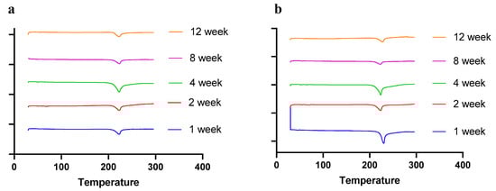 DSC thermographs of spray-dried CFZ SD microparticles during storage for 12 weeks at (a) 4 °C and (b) 25 °C.