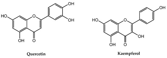 - Jan, R.; Khan, M.; Asaf, S.; Lubna; Asif, S.; Kim, K.-M. Bioactivity and therapeutic potential of kaempferol and quercetin: New insights for plant and human health. Plants 2022, 11, 2623. [Google Scholar] [CrossRef] [PubMed]
