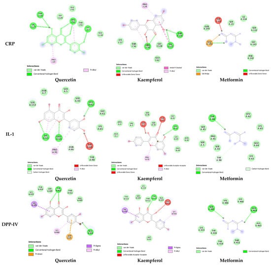 Two-dimensional representation of the interaction between quercetin, kaempferol, and metformin within the binding sites of CRP, IL-1, and the active site of DPP-IV. CRP (PDB ID: 1gnh), DPP-IV (PDB ID: 1j2e), and IL1 (PDB ID: 9ilb). Interaction analysis was carried out using BIOVIA Discovery Studio 2021 and the best pose was selected for each ligand.