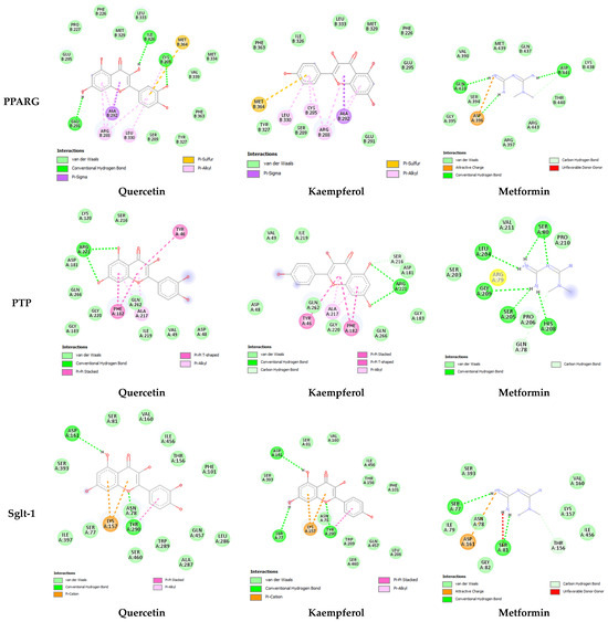 Two-dimensional representation of quercetin, kaempferol, and metformin interaction within canonical thiazolidinedione (TZD) binding sites of PPARG, active site of PTP, and binding site of SGLT-1. Quercetin (PubChem CID: 5280343), Kaempferol (PubChem CID: 5280863), and Metformin (PubChem CID: 4091). PRARG (PDB ID: 1prg), PTP (PDB ID: 2nt7), and SLGT-1 (PDB ID: 7sla). Interaction analysis was carried out using BIOVIA Discovery Studio 2021 and the best pose was selected for each ligand.