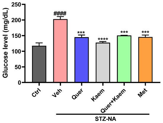 Blood glucose level serves as an ideal biomarker for monitoring and tracking the diabetic status of patients, as it fulfills the necessary criteria for this purpose [46]. The blood glucose level in all mice was increased compared to the control group after STZ-NA injection, confirming the successful induction of diabetes. Blood glucose level was significantly elevated (p < 0.001) in the STZ-NA-treated (diabetic control) group compared to the normal control (Ctrl) group. Oral administration of quercetin (20 mg/Kg), kaempferol (5 mg/Kg), and their combination significantly (p < 0.001) reduced blood glucose levels as compared to metformin (50 mg/Kg), as shown in Figure 4. The combination group was given 10 mg/Kg quercetin and 2.5 mg/Kg of kaempferol.