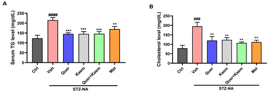 Dyslipidemia is often observed in diabetic patients and is associated with an increase in cardiovascular diseases [47]. The induction of diabetes caused a significant increase in serum triglyceride (TG) and total cholesterol (TC) levels in diabetic mice, which are key factors for the development of cardiovascular diseases. However, in the current study, quercetin, kaempferol, and their combination significantly regulated both serum TG and TC levels, respectively, as shown in Figure 5.