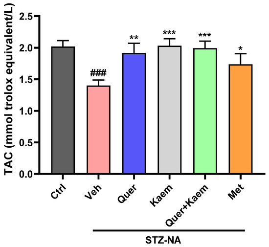 Effect of quercetin, kaempferol, and their combination on TAC status of liver tissue; values are means (n = 3) ± SEM, where n = 3. One-way ANOVA (analysis of variance) and Tukey’s multiple comparison test were applied to find the significance level and represented as p-value. ### p < 0.001 shows comparison of diabetic control with normal control, *** p < 0.001, ** p < 0.01, and * p < 0.05 show the comparison of other groups with diabetic control. Ctrl, normal control; Veh, vehicle (diabetic control); Quer, quercetin; Kaem, kaempferol; and Met, metformin (positive control).