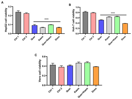 Effect of quercetin, kaempferol, and their combination on the viability of cancer and non-cancer cell lines. (A–C) Shows the effect of quercetin (36 µg/mL), kaempferol (15 µg/mL), their combination (18 µg/mL quercetin + 7.5 µg/mL kaempferol), and doxorubicin (1.8 µg/mL) on the viability of HepG2, Huh-7 (cancer), and Vero (non-cancer) cell lines, respectively. One-way ANOVA (analysis of variance) and Tukey’s multiple comparison test were applied to find the significance level and represented as p-value. **** p < 0.0001 shows comparison of all treatment groups with both controls. Ctrl1, control with distilled water; Ctrl2, control with 0.1–0.2% dimethyl sulfoxide (DMSO); Quer, quercetin; Kaem, kaempferol; and Doxo, doxorubicin as standard anticancer drug. The absorbance was measured at 570 nm.