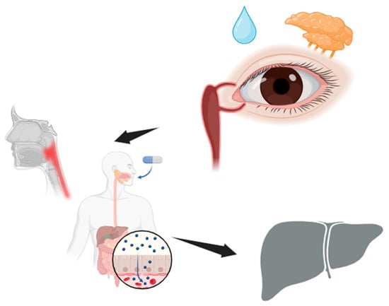 Path of an eye drop via the nasolacrimal duct to the liver. (Created with BioRender.com, accessed on 13 May 2024).