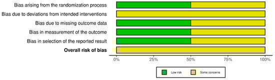 A series of questions (‘signaling questions’) were considered in each domain with the aim of eliciting information about different aspects of the design, conduct, and reporting of the relevant study. Judgments about the risk of bias arising from each domain were based on answers to the signaling questions. Judgments can be a “low” or ‘“high” risk of bias or can express “some concerns”. No domain in the two studies in this review was judged to present a “high” risk of bias. Some concerns were related to the “performance bias” for both included studies, as both express a deviation from the expected intervention (in both cases, there were poisoning and adverse outcomes). A survey by Sihota et al. [58] expressed a “selection bias” and a “detection bias” on account of sampling and grouping/sorting the participants. Lai Becker et al. [59] considered only the pediatric population with a fairly blurred methodology and doubt regarding outcomes. Summary of “risk of bias” assessments is presented in Figure 3.