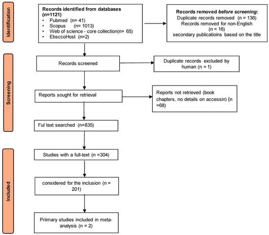 The Preferred Reporting Items for Systematic Reviews and Meta-Analyses (PRISMA) guidelines were considered for conducting the systematic review for this article. The data were gathered from databases that are available via institutional access to the University of Rijeka. The articles indexed in PubMed, Web of Science—core collection, Scopus, and EBSCOhost were included from their inception until 21 February 2024. The search strategy included journal articles and conference proceedings written in English. The title/abstract/keywords of the studies were searched using the terms presented in Table 3. The Boolean operator AND was used while searching.