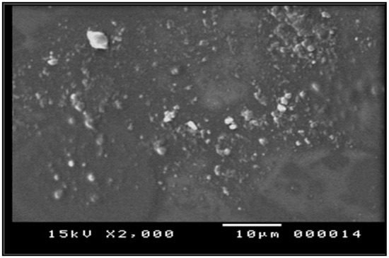 Morphological characterization of prepared film using SEM revealed a smooth background of the film components with small particles well distributed on this base, as seen in Figure 2. The figure shows good distribution of the extract that imparts good loading abilities of the polymer mixture [26].