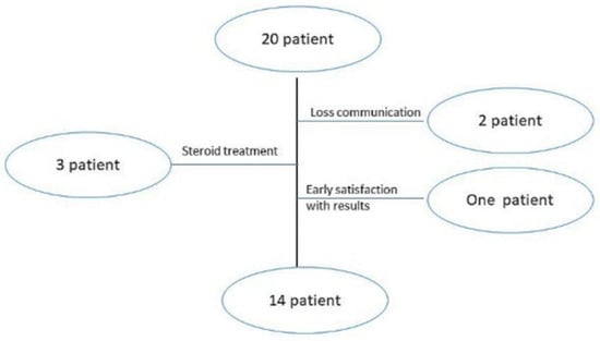 A relevant variation in patient demographics and clinical history was detected in plantar wart recurrence; about 30% of participants suffered from wart return that is reported as part of a special category already suspected for wart return [2]. The participants’ mean age was 45 ± 3 years, with a mean history of warts of 30 ± 7 months; females comprised the highest percentage of patients that may return due to their high emotional problems [27]. Figure 3’s participant flowchart illustrates the number of patients included in the clinical study. There were initially 20 patients included; two participants missed the next schedule due to a breakdown in communication, and three others took oral steroids while undergoing therapy, but steroids can interfere with erythema and pain scoring [27]. The last dropout was a participant who stopped enrolling after five weeks because he was delighted with the outcomes.