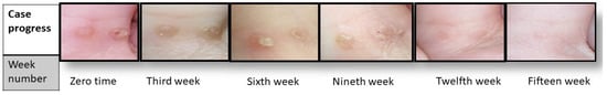 The first clinical examination revealed that the participants had an average of 4 ± 0.4 warts with a diameter of 1.1 ± 0.2 mm. Progress in the clinical signs was supported by episodic photographing showing a reduction in warts remission (number and size), as seen in Figure 4. After fifteen weeks, the results significantly differed between the intervention and placebo group in terms of wart size (p < 0.01) and number (p < 0.05).
