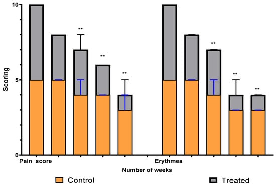 Erythema and pain scoring over fifteen weeks in study groups. ** means significant difference between treated group and control.