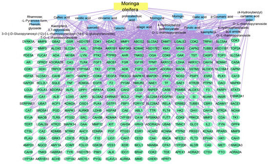Moringa–compounds–targets network: the merged network illustrates the identified compounds from Moringa olifera and the identified targets; the yellow rectangle represents the plant species (Moringa olifera), the blue rectangles represent the identified compounds, and the green ovals shapes represent the identified targets.