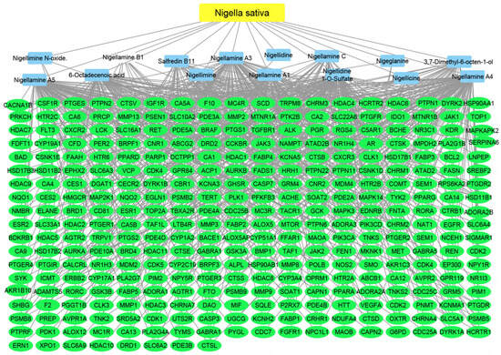 Nigella–compounds–targets network: the merged network illustrates the identified compounds from Nigella sativa and the identified targets; the yellow oval represents the plant species (Nigella sativa), the blue rectangles represent the identified compounds, and the green rectangles represent the identified targets.