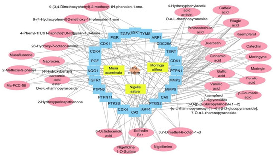 Total pharmacology network: the network combines the plant mixture formed of three plants in yellow rectangles (Musca accuminata, Moringa olifera, and Nigella sativa) with genes (in blue rectangles) related to the human papilloma virus and the compounds of these plants which identified the genes of the human papilloma virus (in pink oval shapes).