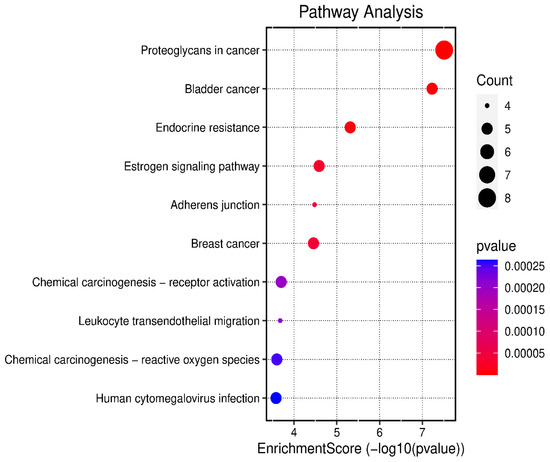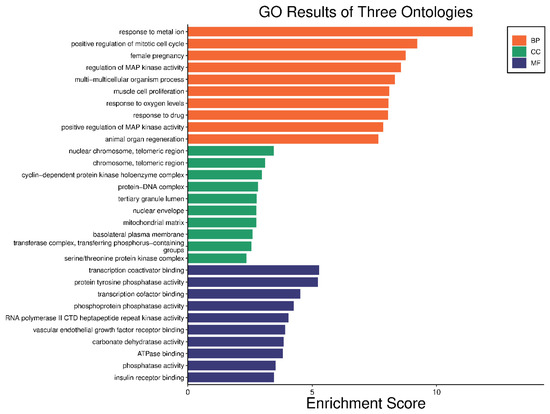 The 24 genes that related to human papilloma virus were the only genes that were used as input data to perform gene enrichment analysis and pathway enrichment. A bioinformatics database illustrated the biological KEGG pathways according to the enrichment score. There were 58 identified biological pathways. The top pathways were proteoglycans in cancer (hsa05205), bladder cancer (hsa05219), and endocrine cancer (hsa01522) (Figure 10 and Table S2). The gene enrichment analysis of annotated genes found a total number of 1837 biological processes for these 24 genes; the top three biological processes were response to metal ions, positive regulation of mitotic cell cycles, and female pregnancy (Figure 11 and Table S3). The gene otology analysis in terms of cellular components identified 113 terms. The top three terms were nuclear chromosome and telomeric region (GO:0000784), chromosome and telomeric region (GO:0000781), and cyclin-dependent protein kinase holoenzyme complex (GO:0000307) (Figure 11 and Table S4). The identified molecular function revealed 167 terms. The top three were transcription coactivator binding (GO:0001223), protein tyrosine phosphatase activity (GO:0004725), and transcription cofactor binding (GO:0001221) (Figure 11 and Table S5).