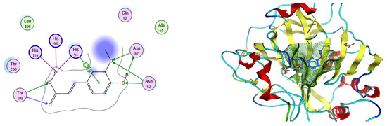 Analysis of the docking data for the tested compounds showed that all of the seven docked compounds represent the most active identified compounds for the aforementioned genes that were docked in a parallel manner to the hCA-2 co-crystalized ligand, with docking scores ranging from −10.08 to −19.82 kcal/mol−1, and in a comparable manner to the co-crystalized sulfonamide ligand inhibitor. The catalytic Zn2+ plays a crucial role at the hCA-2 binding site as well as in the co-crystalized sulfonamide ligand inhibitor. Zn2+ interacts with all three hCA-2 histidine residues (His94, His96, and His119) through ionic bonds and with an additional one or two ionic bonds with ligand functionally (Figure 7, Figure 8, Figure 9 and Figure 10, Table 2). In the case of the sulfonamide ligand inhibitor, sulfonamide oxygen and nitrogen atoms form ionic bonds with Zn2+ and hydrogen bonds with THR199 (Figure 12, Table 2). Nigellidine 1-O-Sulfate is one of the most active identified compounds by the network and has a high docking score, representing Nigella sativa, which was docked in the same manner as the sulfonamide ligand inhibitor, with a high docking score of −19.82 kcal/mol−1, in which its sulfate oxygen atoms interact with Zn2+ through two ionic bonds and with THR199 and HIS96 through hydrogen bonds (Figure 13, Table 2). Ferulic acid is one of the most active identified compounds by the network and has a high docking score, representing Moringa olifera, which was docked in the same manner as the sulfonamide ligand inhibitor, with a docking score of −15.59 kcal/mol−1, in which its carboxylate oxygen interacts with Zn2+ through ionic bonding. Additionally, its carboxylate functionals interact with THR199 through hydrogen bonds, its phenolic hydroxyl and methoxy functionals interact with ASN62, ASN67, THR199, and HIS96 through hydrogen bonds, and its benzene ring interacts with HIS94 through Arene–Arene interactions (Figure 14, Table 2). 9-(4-Hydroxyphenyl)-2-methoxy-1H-phenalen-1-one is one of the most active identified compounds by the network and has a high docking score, representing musca acuminate, which was docked in the same manner as the sulfonamide ligand inhibitor, with a docking score of −14.28 kcal/mol−1, in which its carbonyl oxygen interacts with Zn2+ through ionic bonding. Additionally, its methoxy oxygen atom interacts with THR199 through hydrogen bonds, and its phenolic benzene ring interacts with HIS94 through Arene–Arene interactions (Figure 15, Table 2).