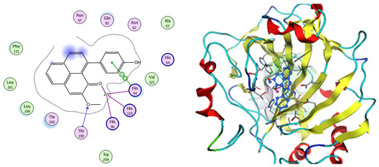 Two-dimensional and three-dimensional representation of 9-(4-Hydroxyphenyl)-2-methoxy-1H-phenalen-1-one interacting with CA-2 amino acid binding site.