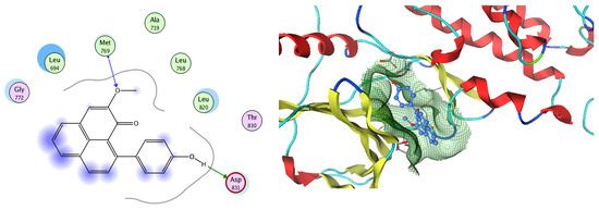 Two-dimensional and three-dimensional representation of 9-(4-Hydroxyphenyl)-2-methoxy-1H-phenalen-1-one interacting with EGFR amino acid binding site.