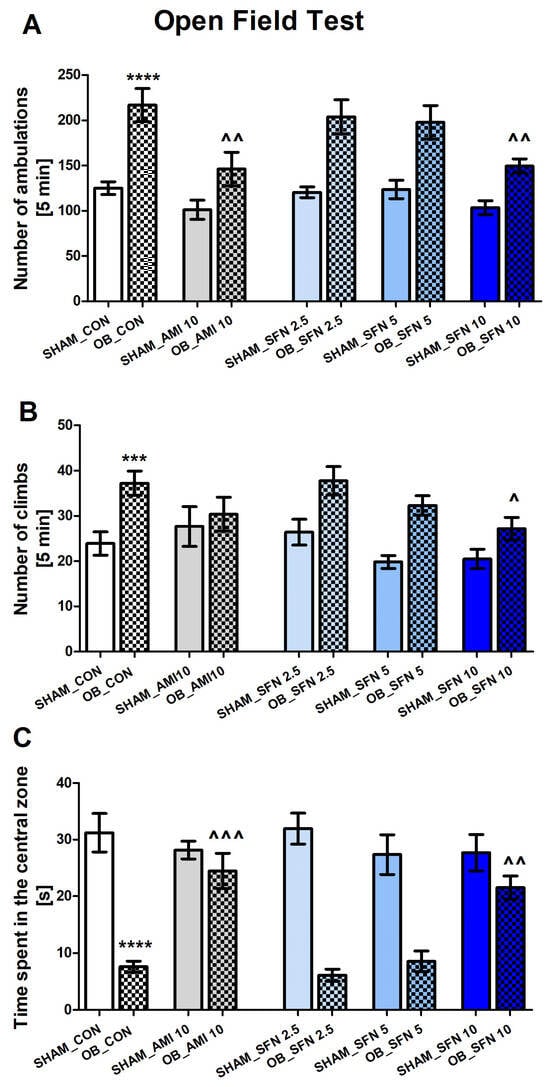The effect of the OB procedure and repeated AMI (10 mg/kg) and SFN (2.5; 5 and 10 mg/kg) administration on the activity of mice in the open field test (OFT3; after a 14-day recovery period; day 30 of the experimental procedure). (A) number of ambulations, (B) number of climbs, and (C) time spent in the central zone. Data were analyzed using a two-way ANOVA and the Tukey Multiple Comparison test. *** p < 0.001, **** p < 0.0001 vs. SHAM_CON, ^ p < 0.05, ^^ p < 0.01, ^^^ p < 0.001 vs. OB_CON. Values are expressed as the mean ± SEM (N = 8–10).