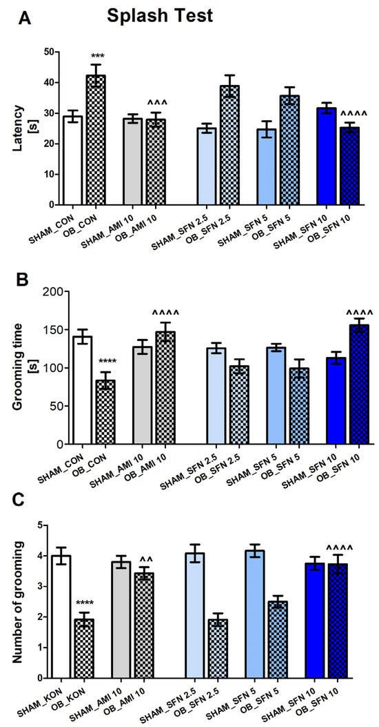 The effect of the OB procedure and AMI (10 mg/kg) and SFN (2.5; 5 and 10 mg/kg) administration on the index of self-care and motivational behavior of mice in the splash test (ST3; day 31 of the experimental procedure). (A) latency, (B) grooming time, and (C) number of grooming instances. Data were analyzed using a two-way ANOVA and the Tukey Multiple Comparison test. *** p < 0.001, **** p < 0.0001 vs. SHAM_CON, ^^ p < 0.01, ^^^ p < 0.001, ^^^^ p < 0.0001 vs. OB_CON. Values are expressed as the mean ± SEM (N = 8–10).