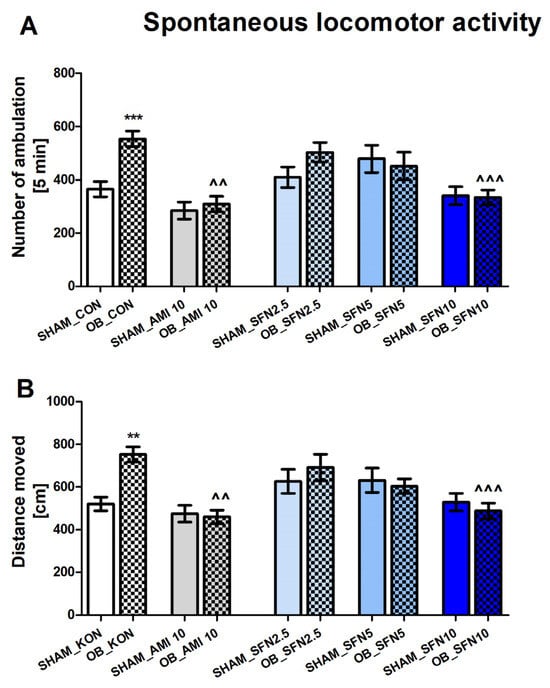 The effect of the OB procedure and repeated AMI (10 mg/kg) and SFN (2.5, 5, and 10 mg/kg) administration on spontaneous locomotor activity (day 32 of the experimental procedure). (A) number of ambulations, and (B) distance moved Data were analyzed using a two-way ANOVA and the Tukey Multiple Comparison test. ** p < 0.01, *** p < 0.001 vs. SHAM_CON, ^^ p < 0.01, ^^^ p < 0.001 vs. OB_CON. Values are expressed as the mean ± SEM (N = 8–10).