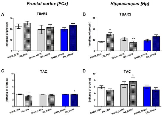 The effect of the OB procedure and repeated AMI (10 mg/kg) and SFN (10 mg/kg) administration on TBARS (A) and TAC (C) levels in the frontal cortex (FCx) and on TBRAS (B) and TAC (D) levels in the hippocampus (Hp). Data were analyzed using a two-way ANOVA and the Tukey Multiple Comparison test. ** p < 0.01 vs. SHAM_CON, ^ p < 0.05, ^^ p < 0.01 vs. OB_CON. Values are expressed as the mean ± SEM (N = 6–7).