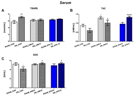 The effect of the OB procedure and repeated AMI (10 mg/kg) and SFN (10 mg/kg) administration on TBARS (A) and TAC (B) levels, and SOD activity (C) in serum. Data were analyzed using a two-way ANOVA and the Tukey Multiple Comparison test. * p < 0.05, *** p < 0.001 vs. SHAM_CON, ^ p < 0.05, ^^^^ p < 0.0001 vs. OB_CON Values are expressed as the mean ± SEM (N = 6–7).