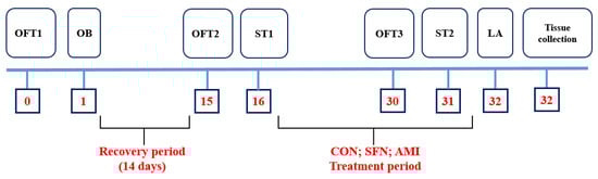 After a 2-week post-surgical period, the mice (both SHAM and OB) were divided into 10 experimental groups (see Table 1), and the administration of drugs was started. (R, S)-Sulforaphane (SFN: 2.5; 5 and 10 mg/kg; an Nrf2 activator; Abcam, Cambridge, UK; cat # ab141969) and amitriptyline (AMI: 10 mg/kg; reference drug; Sigma-Aldrich, Burlington, MA, USA; cat# A8404) were repeatedly administered once daily intraperitoneal (i.p.) for 14 consecutive days. The applied doses of the tested substances were chosen based on previously published studies [33,35,63]. SFN was dissolved in an aqueous solution of 1% dimethyl sulfoxide (DMSO; Sigma-Aldrich, Burlington, MA, USA; CAS # 67-68-5). The control groups received a 1% aqueous DMSO solution. After the 14th dose, the open field test was performed. Drug administration was continued for the next two days. Then, the splash and locomotor activity tests were conducted (Figure 6).