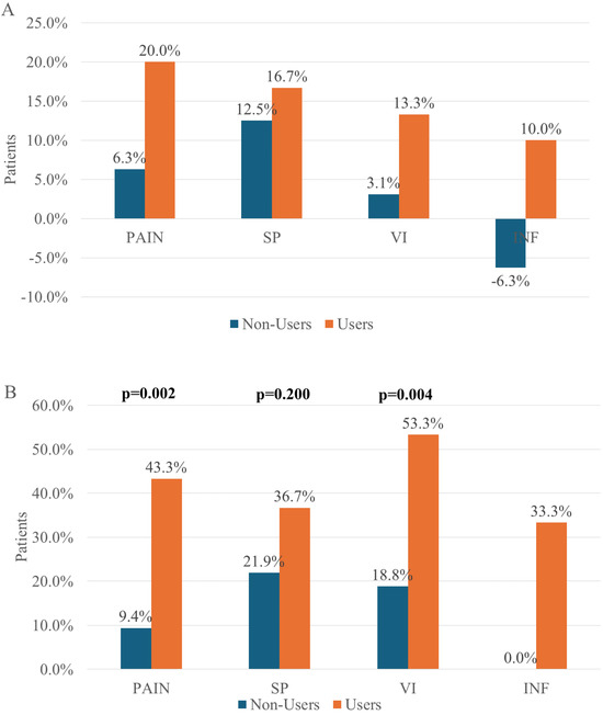 A reduction in pain was observed in 6.3% and 9.4% of non-users after 30 and 90 days of follow up, respectively. A significant decrease in pain was observed in users during the follow-up (20.0% and 43.3% of patients). Moreover, pain improvement was significantly higher in users than non-users in T2 (p = 0.002) (Figure 2B)
