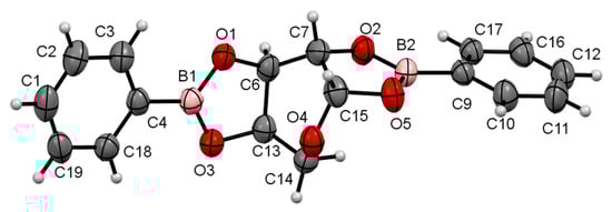 Furthermore, synthetic procedures carried out to form diol–boronic adducts have been explored. In this sense, several adducts derived from phenylboronic acid and carbohydrates, as well as crystals derived from β-fructopyranose [6], α-d-glucofuranose [7], and β-d-arabinopyranose [8], have been reported. The formation of these adducts is interesting, among other reasons, because of the disposition of different hydroxyl groups with the feasibility of reaction. In previously reported structures, the formation of diester bonds has been observed in a stereoselective reaction, while the formation of several different five- or six-ring carbohydrates is also possible [9]. The applications of these structures are yet to be explored; however, they have been studied in the field of biomaterials for the design of sensors [10]. One of the most promising applications as sensors involves the development of self-regulated insulin delivery materials in the control of glycemia of patients living with diabetes mellitus [11,12]. Other types of boron-containing monosaccharides have been designed for the overexpression of glucose transporters in brain tumors because of the increased anaerobic metabolism in cancerous cells [13].