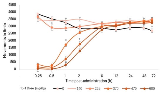 Figure 4. Motor performance in the open-field test. Motor activity that occurred within 5 min and the effect on locomotion after FB-1 administration. The markers represent the mean, while the bars represent the standard error of the mean. Asterisks indicate the lowest dose, which, at each measured time, reduced the total movements compared to the control group, p < 0.05; n ≥ 4.