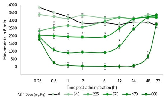 Figure 5. Motor performance in the open-field test. Motor activity that occurred within 5 min and the effect on locomotion after AB-1 administration. The markers represent the mean, while the bars represent the standard error of the mean. Asterisks indicate the lowest dose, which, at each measured time, reduced the total movements compared with the control group, p < 0.05; n ≥ 4.
