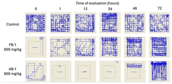 Additionally, a motor evaluation was performed as a complement to the visual evaluation of sedation and hypnosis because it allowed for the observation of diminished activity after FB-1 or AB-1 administration (Figure 4, Figure 5 and Figure 6). As notable in the plots, FB-1 administration (at doses of ≥370 mg/kg) induced sedation and diminished motor activity before the first hour with recovery at 6 h, while AB-1 administration (at doses of ≥225 mg/kg) induced sedation and diminished motor activity before the first hour with recovery at 6 to 72 h (dose-dependent).
