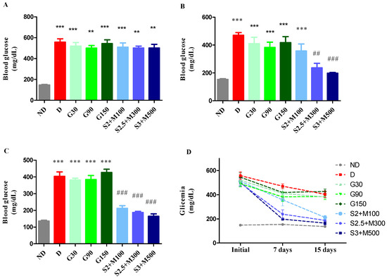 (A) Initial glycemia. (B) Glycemia at 7 days. (C) Glycemia at 15 days. (D) Evolution of the mean blood glucose levels during the experiment. Values are expressed as mean + S.E.M (standard error of the mean). ** p < 0.01; *** p < 0.001 vs. ND. ## p < 0.01; ### p < 0.001 vs. D.