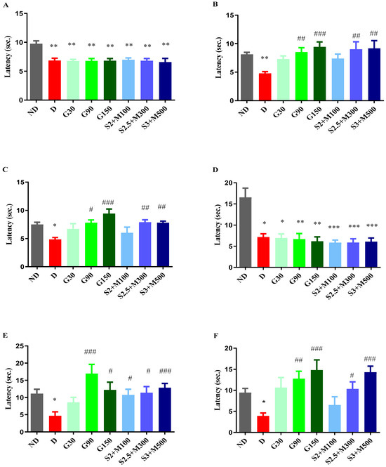 (A) Hot plate test—initial pain reaction latency. (B) Hot plate test—pain reaction latency after 7 days. (C) Hot plate test—pain reaction latency after 14 days. (D) Cold plate test—initial pain reaction latency. (E) Cold plate test—pain reaction latency after 8 days. (F) Cold plate test—pain reaction latency after 15 days. Values are expressed as mean + S.E.M. * p < 0.05; ** p < 0.01; *** p < 0.001 vs. ND. # p < 0.05; ## p < 0.01; ### p < 0.001 vs. D.