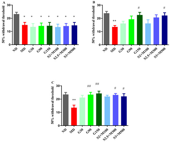 After 14 days of treatment, the G90 and G150 groups demonstrated significant increases in the 50% withdrawal threshold in the von Frey test when compared to the D group (p < 0.01, Figure 3C). The most pronounced antihyperalgesic effect was demonstrated by the group treated with a dose of 150 mg · kg−1 of gabapentin (79.18%). On the other hand, our research highlighted the fact that the S2.5 + M300 and S3 + M500 combinations significantly reduced pain sensitivity when compared to the D group, with effects of 71.18% and 63.25%, respectively (p < 0.05, Figure 3C).