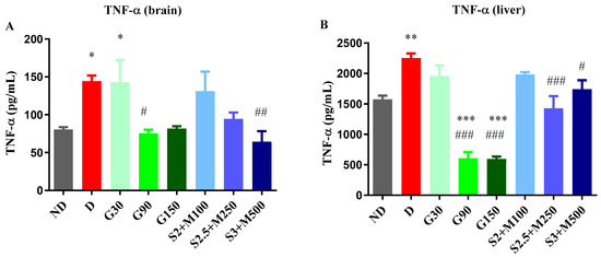 Regarding the level of TNF-α, the ANOVA test revealed significant variations among the groups, both in the brain tissues (F = 4.156, p = 0.0018, Figure 4A) and in the liver tissues (F = 26.15, p < 0.0001, Figure 4B). The D group and the G30 group showed significant increases when compared to the ND group, while all the other diabetic groups reduced the level of TNF-α, with significantly lower values for the G90 and S3 + M500 groups in the brain tissue when compared to the D group (p < 0.05, Figure 4A), with a percentage of 75.39% and 94.4%, respectively. On the other hand, in liver tissues, TNF-α concentration was markedly increased in the D group, while the G90, G150, S2.5 + M300, and S3 + M500 groups had significantly reduced levels when compared to the D group (p < 0.05, Figure 4B).