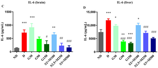 (A) Variation in TNF-α in rat brain tissues. (B) Variation TNF-α in rat liver tissues. (C) Variation in IL-6 in rat brain tissues. (D) Variation in IL-6 in rat liver tissues. Values are expressed as mean + S.E.M. * p < 0.05; ** p < 0.01; *** p < 0.001 vs. ND. # p < 0.05; ## p < 0.01; ### p < 0.001 vs. D.