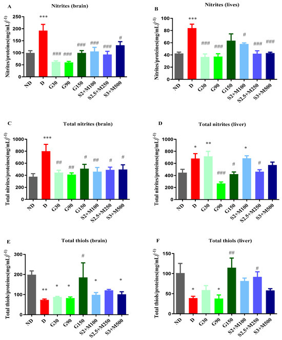 (A) Variation in nitrites/proteins ratio in rat brain tissues. (B) Variation in nitrites/proteins ratio in rat liver tissues. (C) Variation in total nitrites/proteins ratio in rat brain tissues. (D) Variation in total nitrites/proteins ratio in rat liver tissues. (E) Variation in total thiols/proteins ratio in rat brain tissues. (F) Variation in total thiols/proteins ratio in rat liver tissues. Values are expressed as mean + S.E.M. * p < 0.05; ** p < 0.01; *** p < 0.001 vs. ND. # p < 0.05; ## p < 0.01; ### p < 0.001 vs. D.