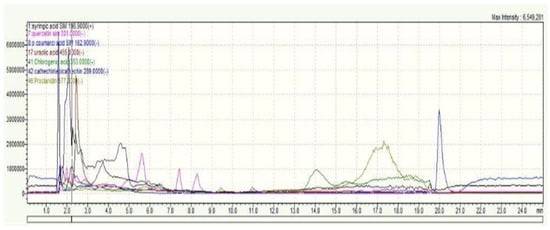 The UHPLC-MS (Ultra-High-Performance Liquid Chromatography-Mass Spectrometry) analysis of the hydroethanolic extract of C. monogyna’s aerial parts (leaves and stems) revealed the presence of a diverse array of phenolic compounds, as illustrated in Figure 1. Through meticulous comparison with a lab-produced dataset (Supplemental 1 Supplementary Materials), we were able to identify several key phenolic compounds within the extract. These include syringic acid, p-coumaric acid, quercetin, resveratrol, verbascoside, catechin, epicatechin, chlorogenic acid, ursolic acid, cyanidin, and quercetin.