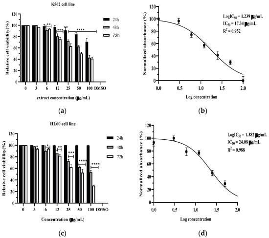 The cytotoxic effect of the C. monogyna hydroethanolic extract. K562 (a) and HL60 (b) cell lines were treated with different concentrations of the C. monogyna extract (3–100 µg/mL) for 24, 48, and 72 h time points. The IC50 for K562 (c) and HL-60 (d) was estimated using nonlinear regression (GraphPad Prism v. 5 software). The results are expressed as mean ± SD of three independent experiments. Statistical significance compared to the negative control (untreated cells) is denoted as follows: * p < 0.05, ** p < 0.01, *** p < 0.001, **** p < 0.0001.