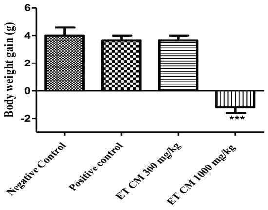 The effect of C. monogyna hydroethanolic extract on the body weight of mice during the hepatotoxicity test. Results are expressed as mean ± SEM (n = 5). Results are considered statistically significant compared to the negative control group (*** p < 0.001).