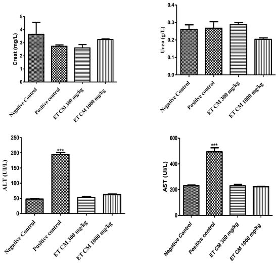 In accordance with guidelines for animal testing [], the mice were administered sodium through an injection into their abdominal cavity (50 mg/kg) to induce anesthesia. The tested mice’s blood was collected using tubes containing heparin (10 U/mL heparin), then spun in a centrifuge at 1500 rpm for 10 min. Subsequently, the plasma was examined for parameters such as ALT, AST (serum transaminases), urea, and creatinine levels (Crea) [].