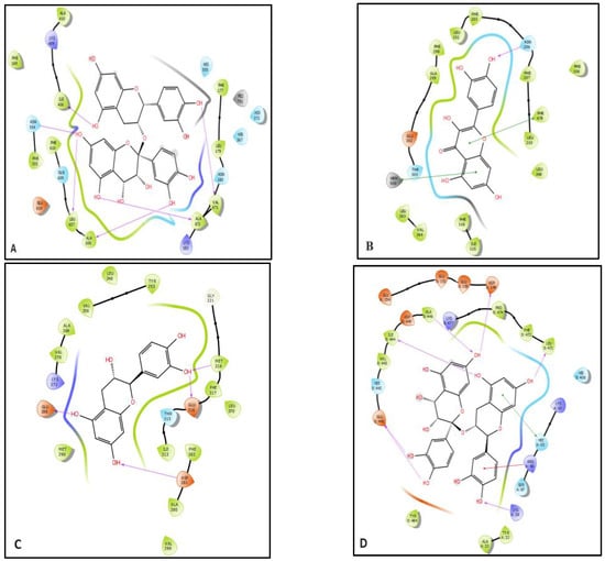 The 2D viewer of ligand interactions with the active site. (A,D): Procyanidin interactions with the active site of lipoxygenase and TRADD. (B): Quercetin interactions with the active site of human cytochrome P450 2E1. (C): Catechin interactions with the active site of tyrosine kinase.