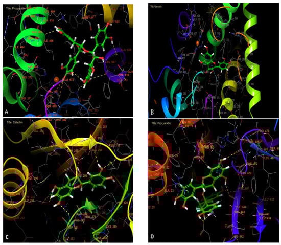 The 3D viewer of ligand interactions with the active site. (A,D): Procyanidin interactions with the active site of lipoxygenase and TRADD. (B): Quercetin interactions with the active site of human cytochrome P450 2E1. (C): Catechin interactions with the active site of tyrosine kinase.