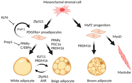 The “first wave” of the adipogenic cascade also includes Krüppel-like factors that are involved not only in adipogenesis but also in the processes of cellular growth and apoptosis. KLFs are characterized by their ability to bind to CACCC-box and GC-rich regions of DNA, through which they regulate the transcription of target genes. Several KLFs are known for their ability to promote adipogenesis. For example, KLF4 is induced by cAMP and promotes adipogenesis by controlling C/EBPβ expression [79]. KLF5 facilitates adipogenesis through the activation of main adipogenic transcription factors such as PPARγ and C/EBPα [80]. KLF6 promotes preadipocyte differentiation (Figure 1) by repressing a gene coding for preadipocyte factor named Delta-like 1 (Dlk1, or Pref1), which is a well-known autocrine suppressor of adipogenesis [81]. On the other hand, several KLF factors suppress adipogenesis: KLF2 inhibits the Pparg gene expression [82], KLF3 represses the transcription of C/EBPα by recruiting C-terminal binding protein (CtBP) corepressors [83], and KLF7 inhibits adipogenesis by decreasing the expression of both PPARγ and C/EBPα [84]. Importantly, there is a member of the KLF family, KLF11, that acts specifically to promote white-to-beige transdifferentiation by altering the “superenhancers” bound by PPARγ towards the set selective for beige adipocytes [85].