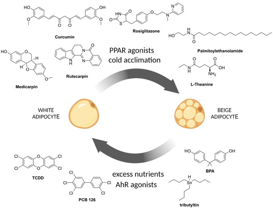 Compounds that counteract the beigeing process include polychlorinated biphenyls and dioxins. Polychlorinated biphenyls (PCBs) are a group of industrial chemicals that were banned in the 1970s but are still present in the environment due to their persistence. Exposure to PCB126 was shown to impair adipogenesis and alter adipocyte metabolism [216]. PCB126-induced disruption resulted in a significant reduction in fully differentiated adipocytes due to PPARγ inhibition. The reduction in PPARγ transcript levels observed was accompanied by the activation of AhR by PCB126. PCBs have a dioxin-like structure and therefore bind to and activate the aryl hydrocarbon receptor (AhR). Moreover, when the cells were exposed to PCB126 during differentiation, the browning of white adipose tissue was inhibited by disrupting mitochondrial uncoupling and energy expenditure [217]. Differentiated adipocytes exposed to PCB126 had a reduced ability for UCP1-related uncoupling.