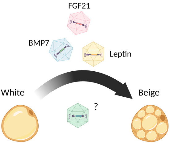 Viral gene delivery is the most common type of gene therapy approach used to convert WAT into beige adipose, to achieve stable ubiquitous or tissue-specific overexpression of target genes and increase energy expenditure. Different types of noninfective recombinant viruses, including adenovirus, retrovirus, lentivirus, and adeno-associated virus (AAV) were used to direct the transgene expression in adipose tissue [255]. However, it was shown, that adenovirus, retrovirus, and lentivirus are immunogenic and do not provide the long-term transgene expression [256,257,258,259]. Moreover, gamma-retroviruses and lentiviruses are characterized by an increased risk of carcinogenicity and genomic instability due to their ability to integrate into the host genome [260,261]. In contrast, AAV vectors (Figure 3) are characterized by low immunogenicity, low toxicity, and carcinogenicity risk, are present in the nucleus in the form of episomes, and provide stable and long-term transgene expression [255,262].