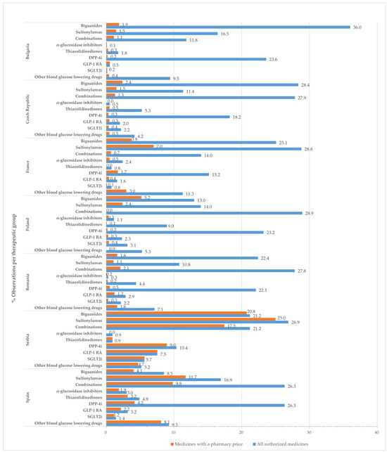 Comparing the approved INNs grouped by class, our study showed that metformin, acarbose, and pioglitazone were both authorized and had a price in all countries (except for acarbose in Serbia and pioglitazone in France). Gliclazide and glimepiride were the only sulfonylureas found in medicines with an available retail price in all countries. The largest number of authorized active substances were in the Czech Republic and Poland (41), while Spain had the highest number of marketed substances (38). In Bulgaria, all authorized substances were found in commercialized medicines, and this situation is mirrored in Serbia (96%) and Spain (97%), where a similarly high percentage of authorized substances have price listings at pharmacies. It is important to have a diverse range of therapeutic options authorized, but they must also be available (having a price and no supply problems), accessible (affordable with respect to cost), and recommended for treatment to patients. Due to limited national regulatory and administrative reimbursement policies, not all medicines dispensed on a medical prescription are reimbursed by health insurers, and in such cases, the entire cost is to be paid by patients. For instance, this is the case for antidiabetic therapy in Poland. The Polish diabetes guidelines from 2022 mentioned the limited reimbursement of the new antidiabetic agents. According to the guidelines, six drug classes are recommended for type 2 diabetes treatment (leaving aside basal insulin): biguanides (metformin), sulfonylurea derivatives, SGLT-2 inhibitors, DPP-4 inhibitors, GLP-1 receptor agonists, or PPAR-γ agonists (pioglitazone) [37]. In line with international guidelines, diabetes care in Poland has the reduction of associated acute and chronic complications as its main therapeutic objective [38]. However, our study showed that there was a reduced number of marketed brand names compared with the approved ones, including several new antihyperglycemic agents with cardio-renal benefits (GLP-1 RA, SGLT-2 i, DPP-4 i). A study based on data from the National Health Funds (2012–2015) revealed that medicines with alpha-glucosidase inhibitors (volume-1%), thiazolidinediones (no sale), and DPP-4i (volume from 0.003% to 0.009%) were rarely prescribed in Poland [39].